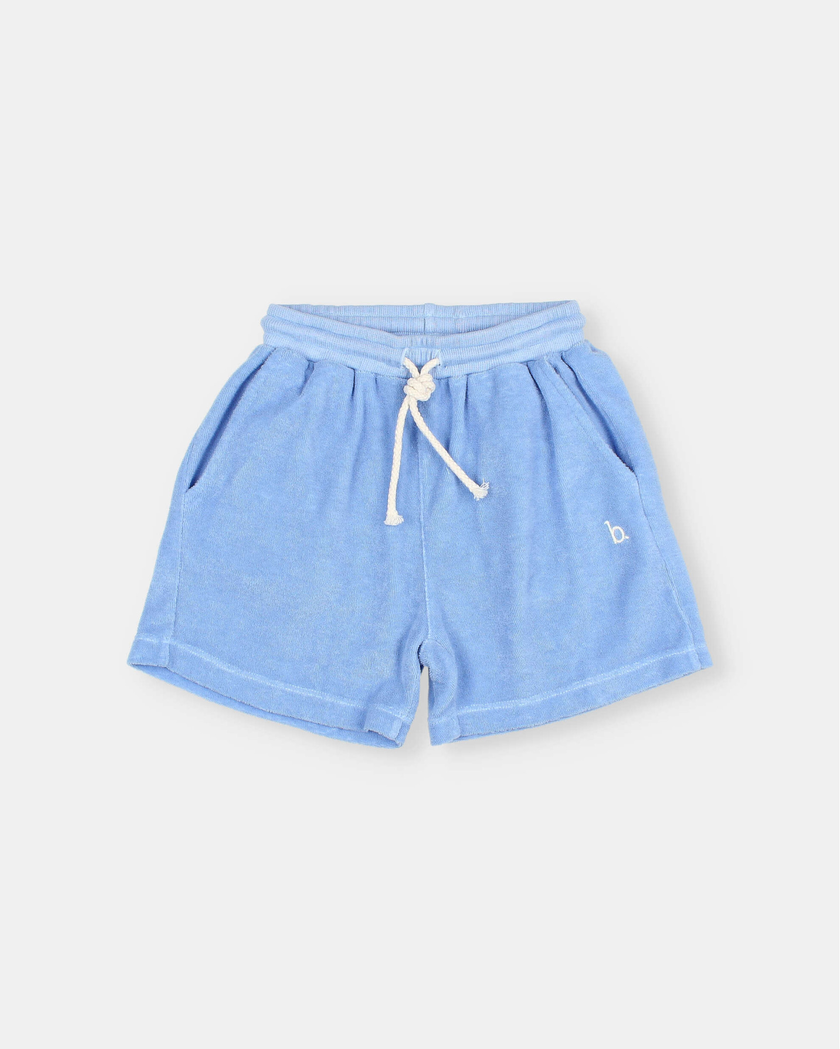 Pantalón corto de rizo. Cintura de canalé elástica con cordón de algodón crudo para mejor ajuste. Bolsillos frontales. Bolsillo tipo plastrón en la espalda. Detalle bordado a contraste.