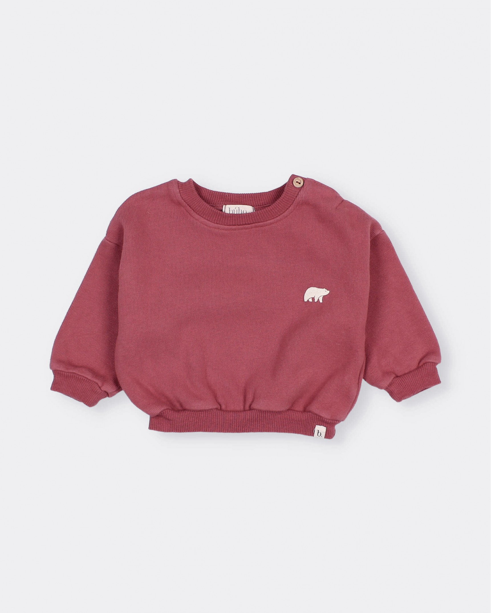 Sudadera de felpa suave. Estampado motivo oso en el pecho. Estampado "hibernation" en la espalda. Cuello redondo con cierre botón en el hombro. Etiqueta tab en el bajo. Acabados acanalados.
