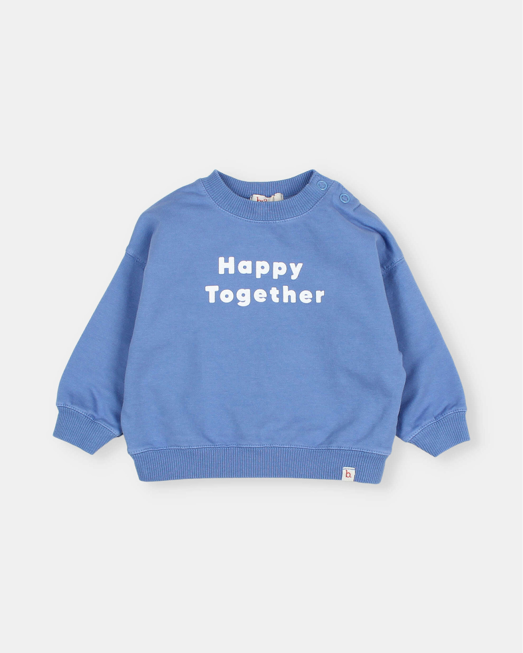 Sudadera de felpa suave con motivo happy estampado en el pecho. Cuello redondo con cierre botones a presión en el hombro.