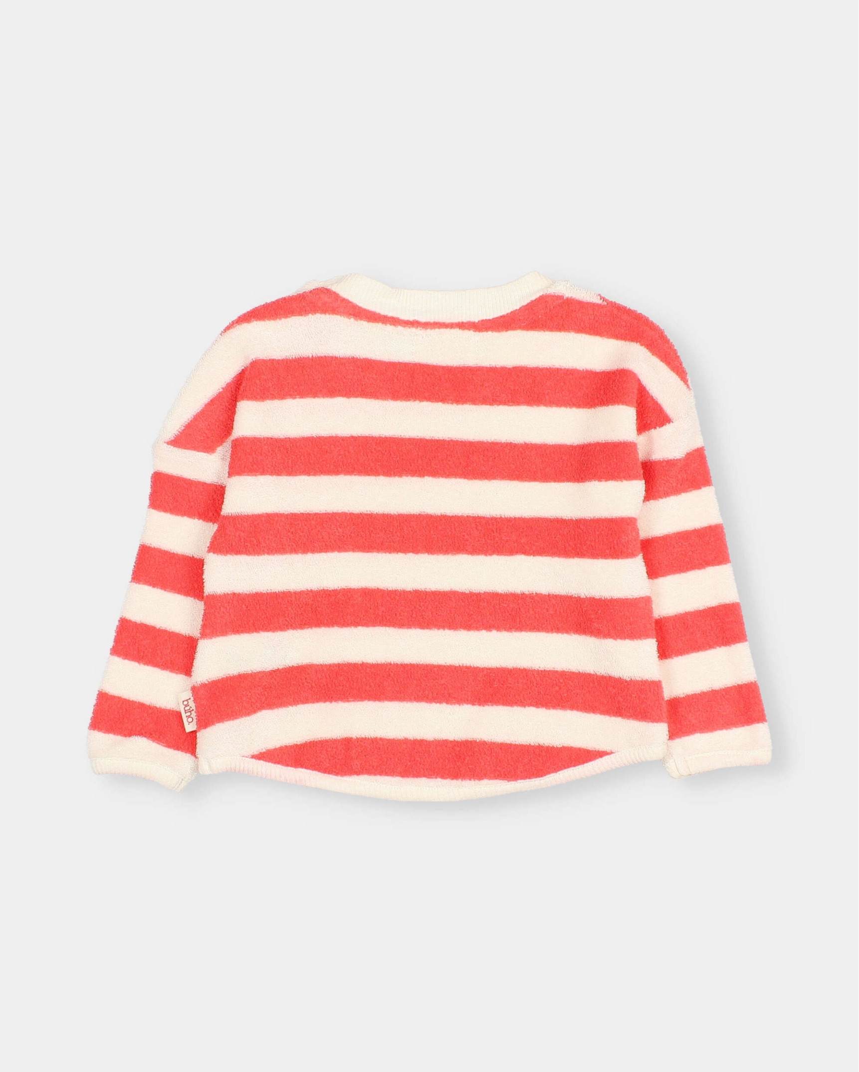 Sudadera de rizo suave de algodón orgánico tejido a rayas. Manga larga. Cuello redondo con cierre botones a presión en el hombro. Acabados escote, bajo y puños en canalé de algodón crudo.
