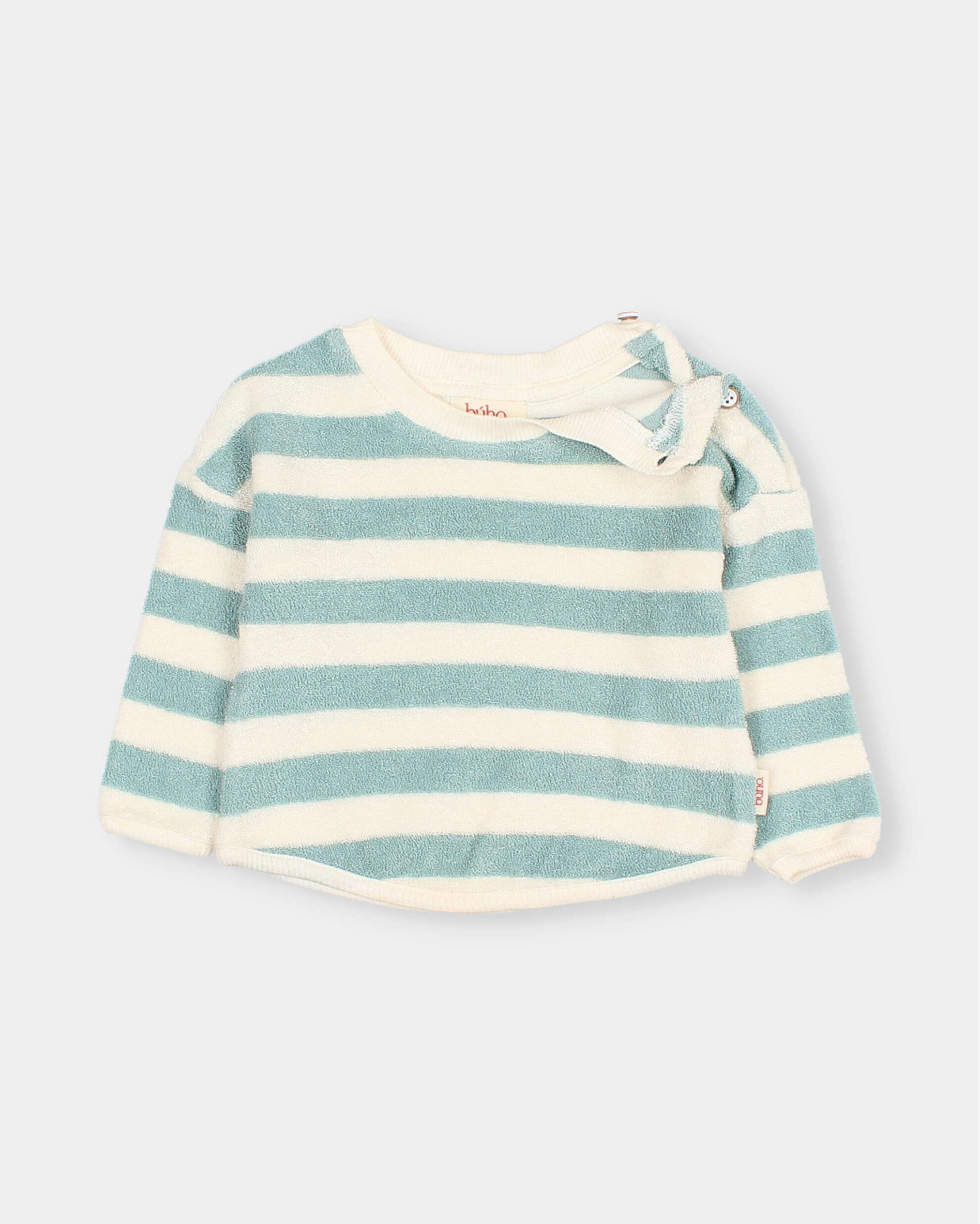Sudadera de rizo suave de algodón orgánico tejido a rayas. Manga larga. Cuello redondo con cierre botones a presión en el hombro. Acabados escote, bajo y puños en canalé de algodón crudo.