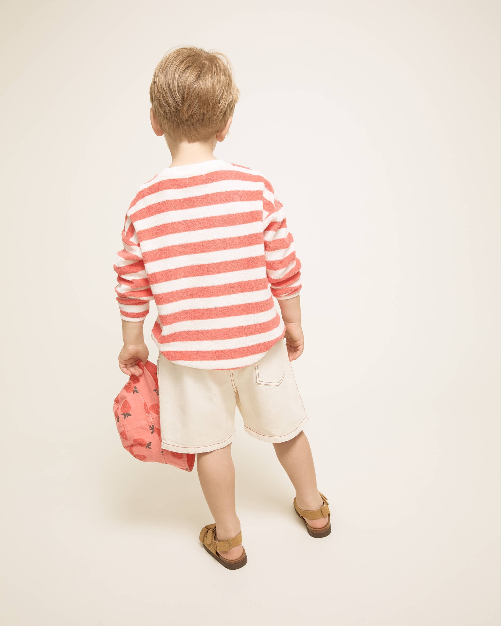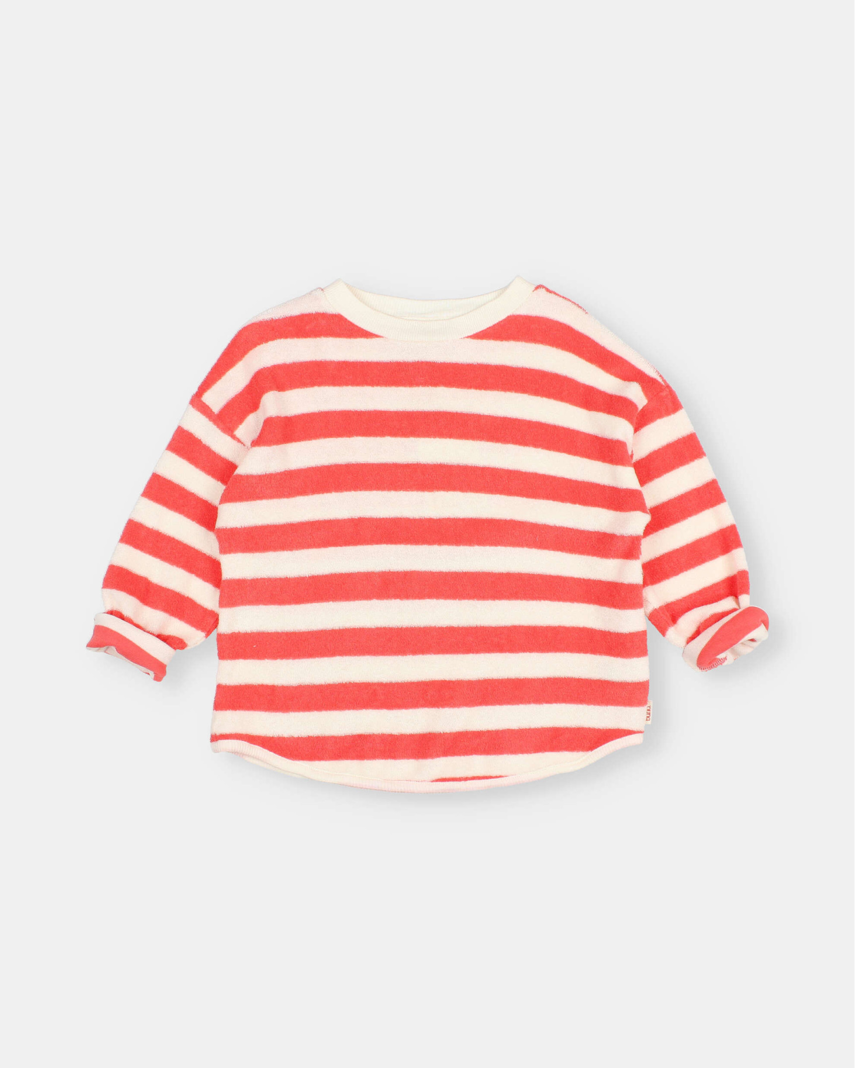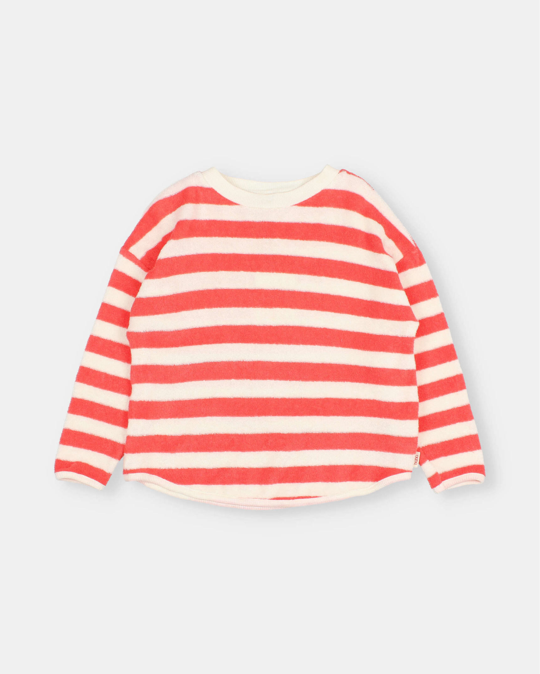 Sudadera de rizo suave de algodón orgánico tejido a rayas. Manga larga. Cuello redondo. Acabados escote, bajo y puños en canalé de algodón crudo.