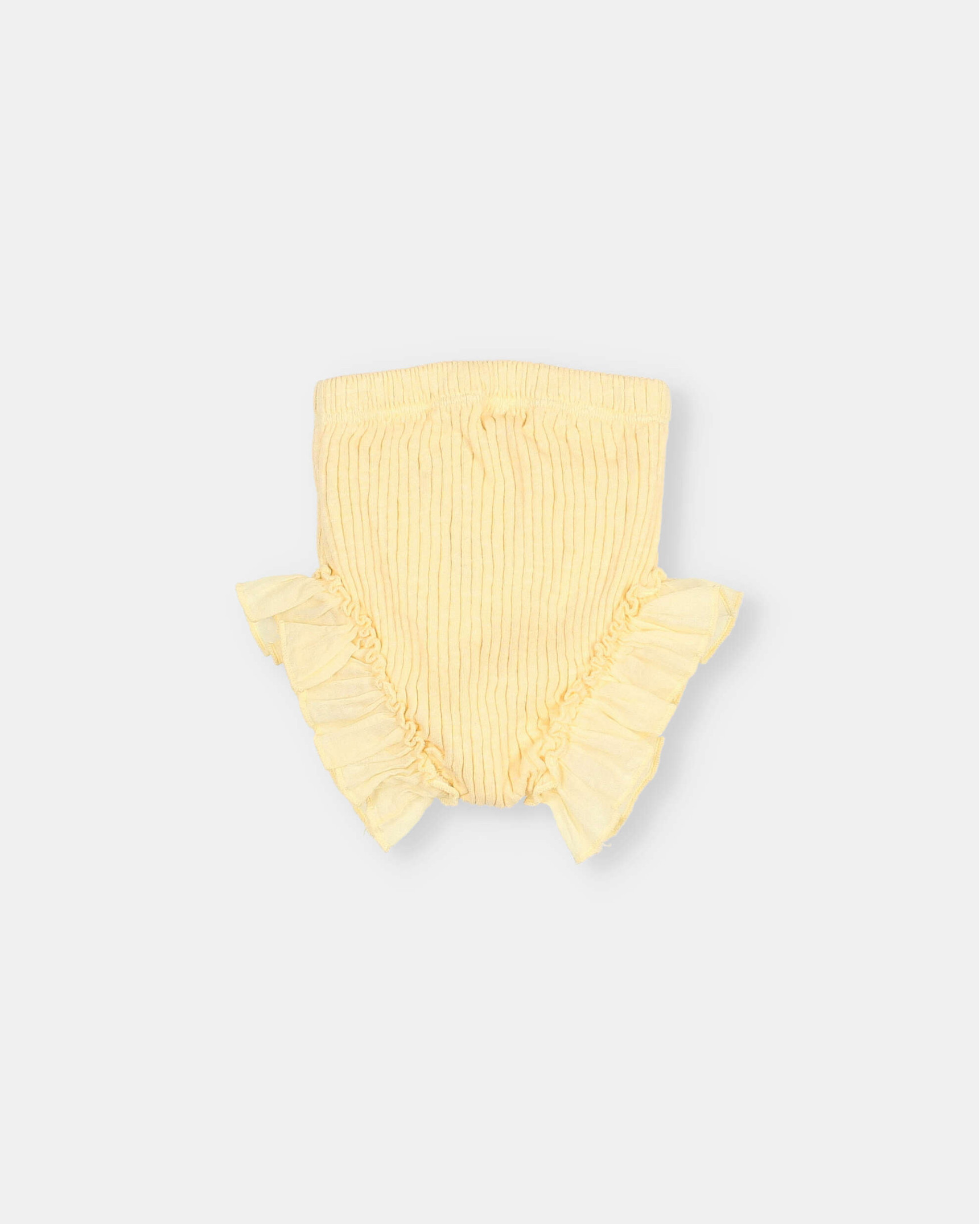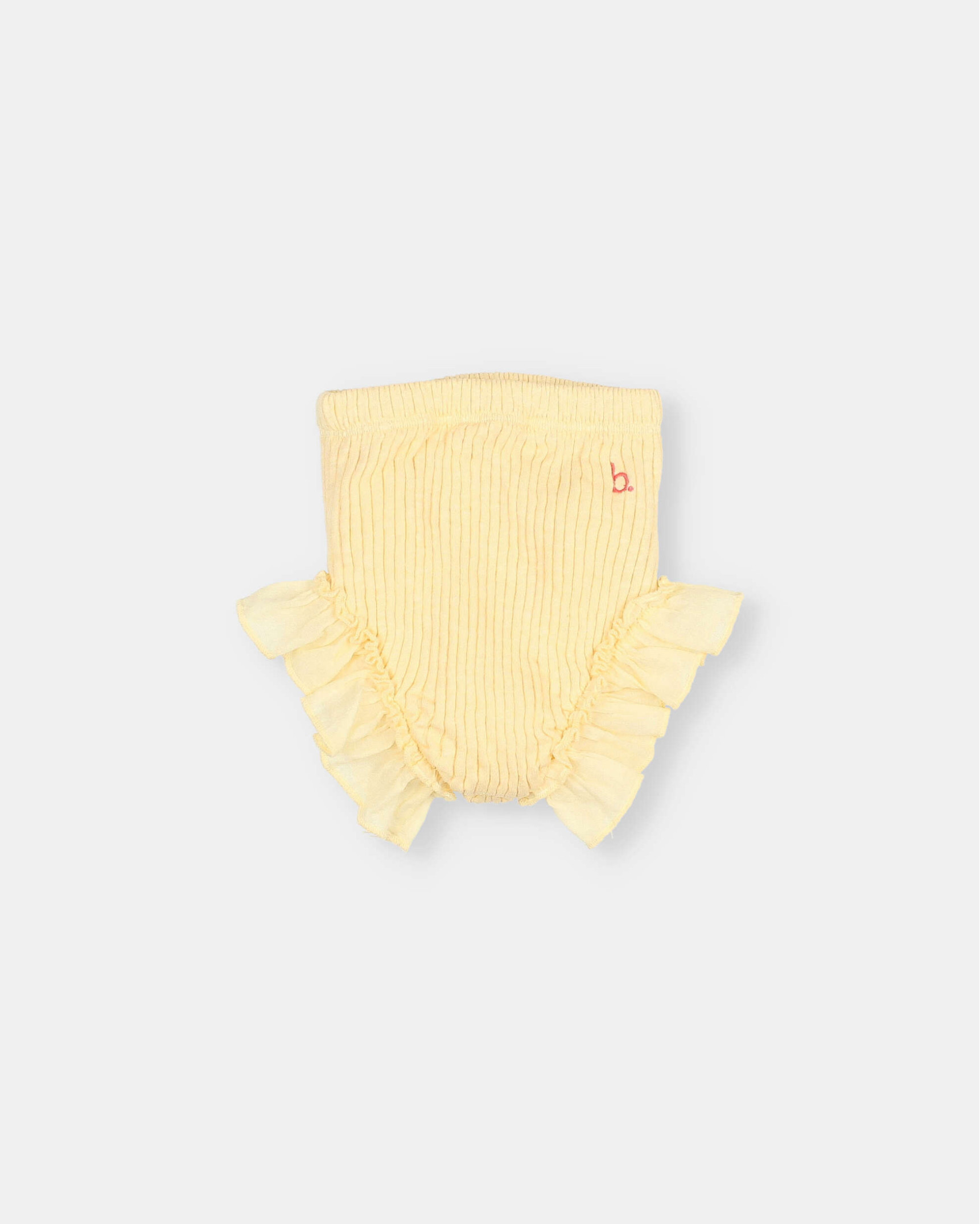 Culotte acanalado en algodón orgánico con bordado decorativo a contraste. Goma elástica en la cinturilla y muslos. Volantes de voile de algodón en camales.