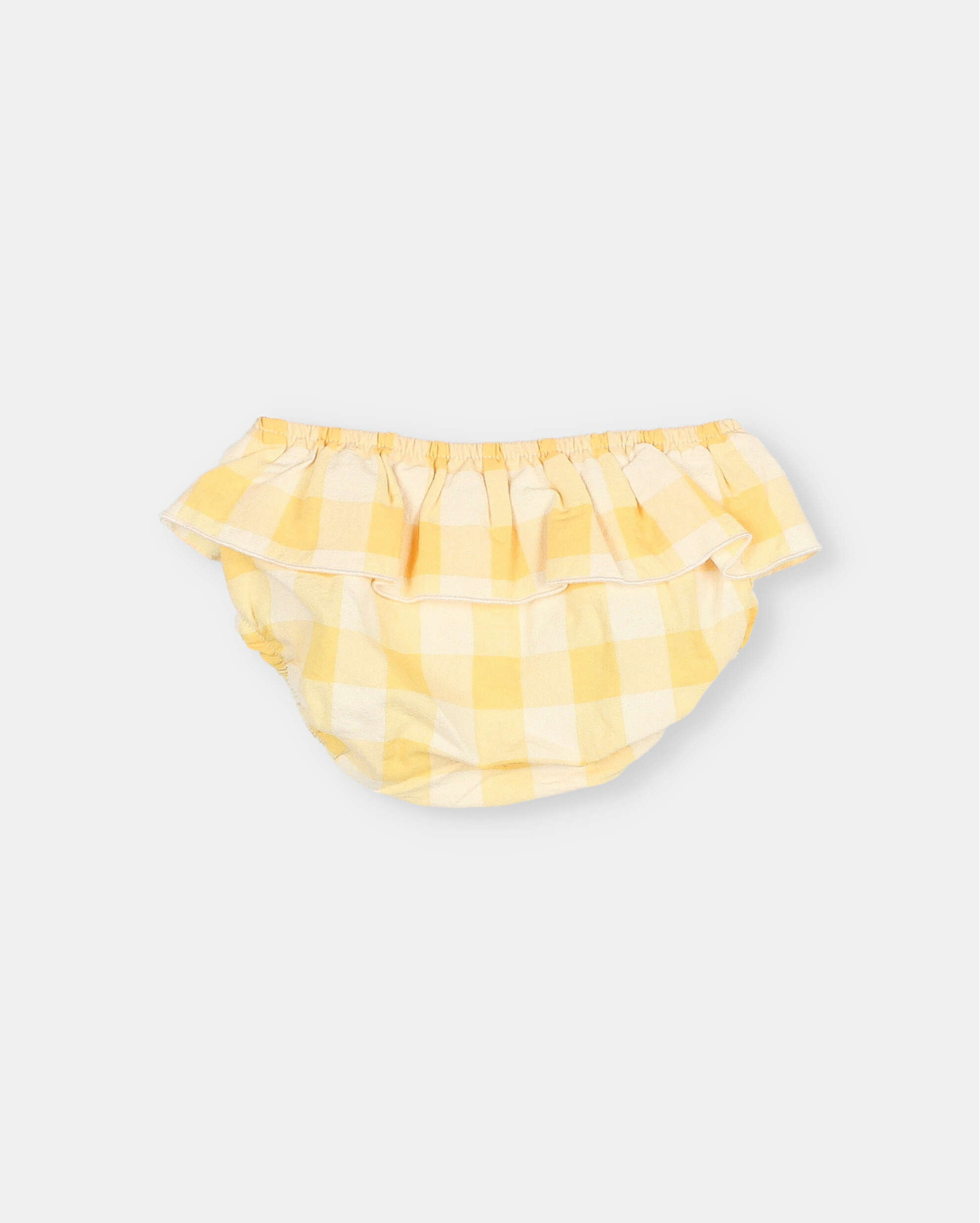 Culotte de cuadro vichy en seersucker de algodón. Goma elástica en la cinturilla y muslos. Cintura con volante y bordado a contraste al costado.