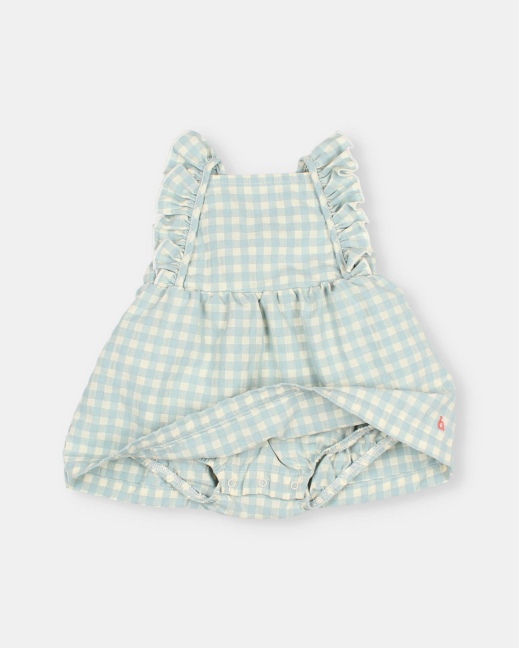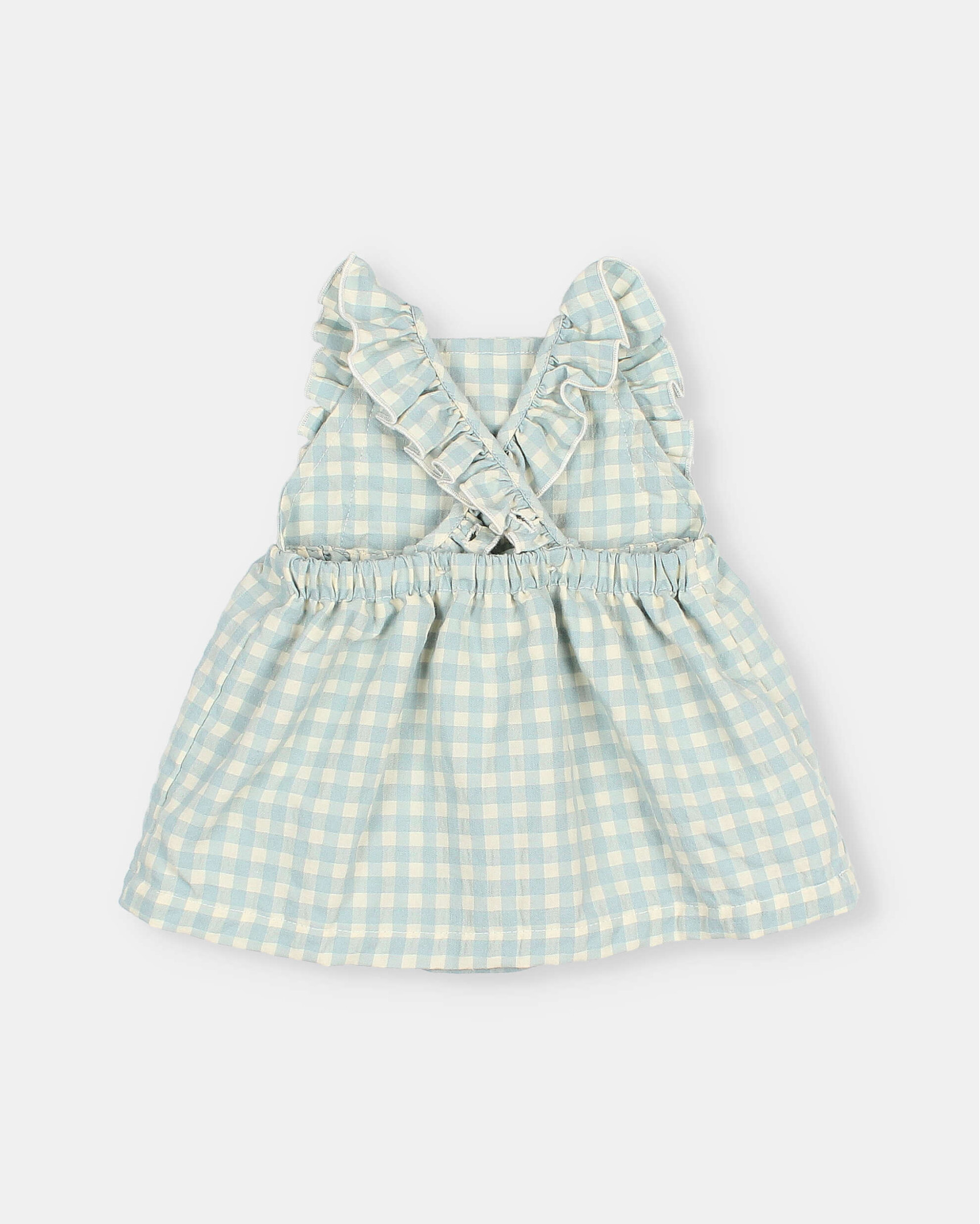 Vestido de cuadro vichy en seersucker de algodón. Escote recto. Tirantes con volante cruzados por la espalda. Detalle bordado a contraste en el bajo. Culotte interior con botones de presión en la entrepierna para una puesta fácil. Goma elástica en la espalda y muslos.