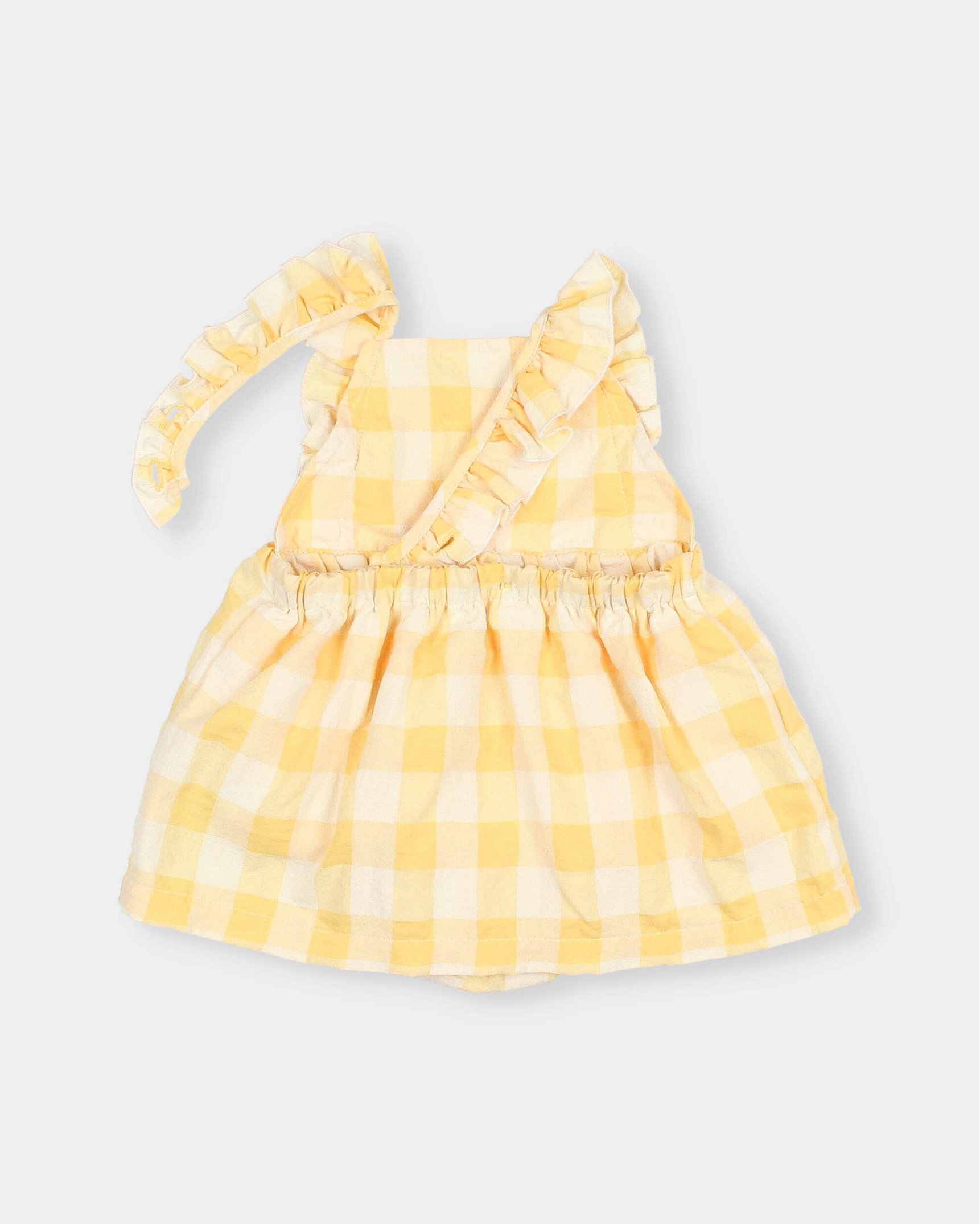 Vestido de cuadro vichy en seersucker de algodón. Escote recto. Tirantes con volante cruzados por la espalda. Detalle bordado a contraste en el bajo. Culotte interior con botones de presión en la entrepierna para una puesta fácil. Goma elástica en la espalda y muslos.