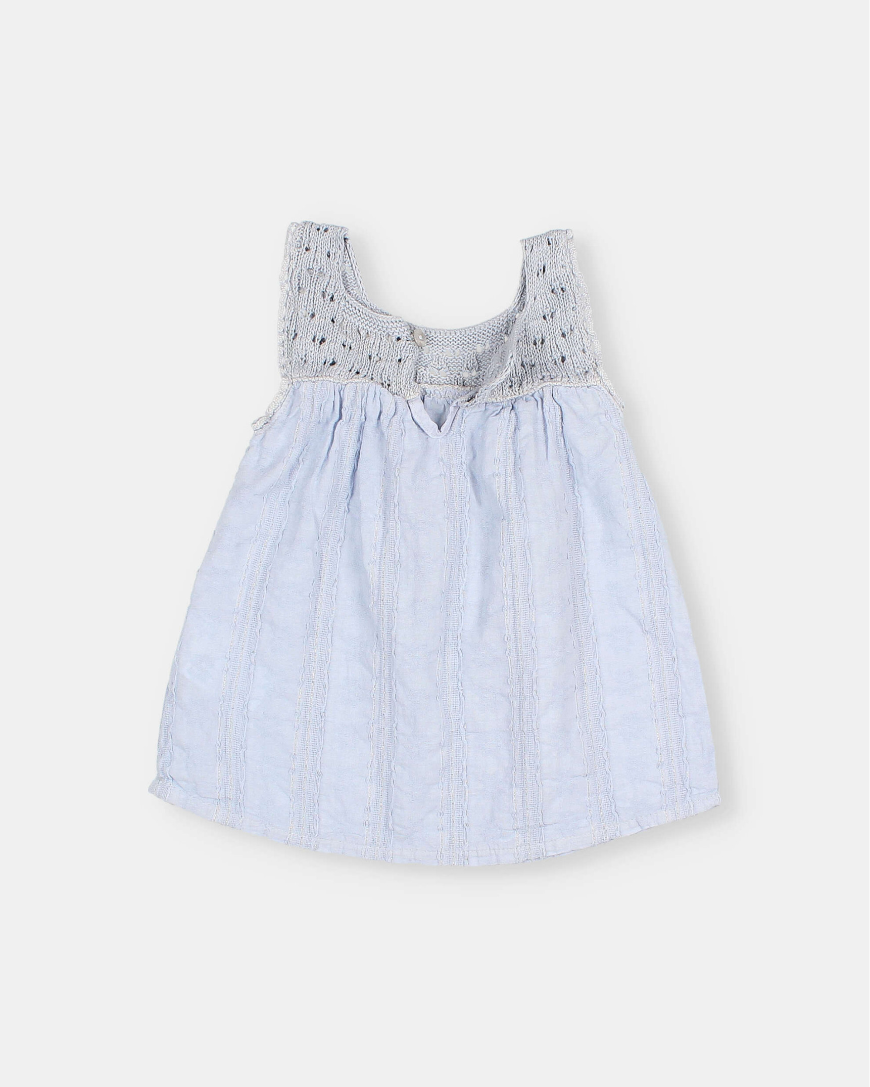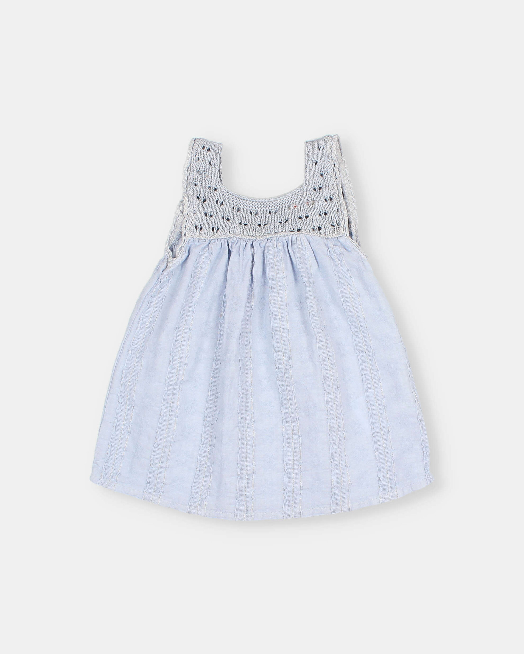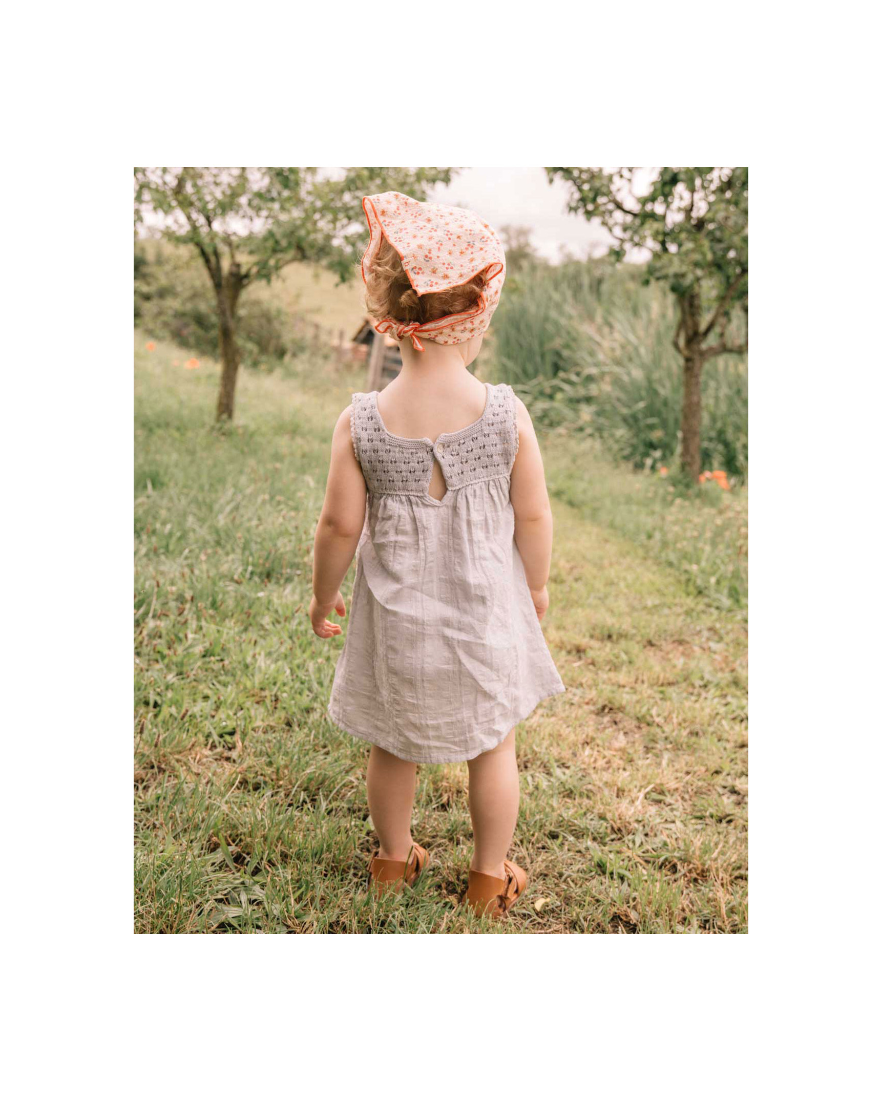 Vestido con cuello redondo y tirantes con volante. Parte superior acanalada. Apertura tipo lágrima con botón de madera en la espalda. Falda de algodón orgánico texturado con estampado strawberry. Culotte interior con botones de presión en la entrepierna para una puesta fácil. Goma elástica en la cinturilla y muslos.