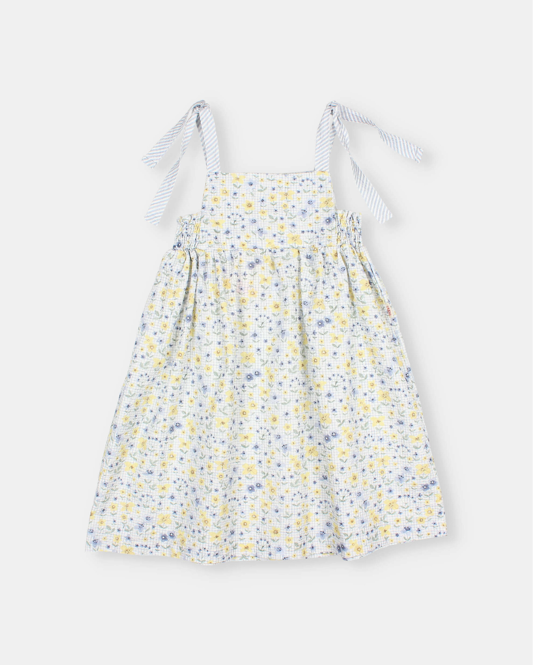 Vestido en seersucker de algodón con estampado picnic. Escote recto. Tirantes con cinta de rayas ajustables. Detalle gomas en los laterales del top. Falda con vuelo.