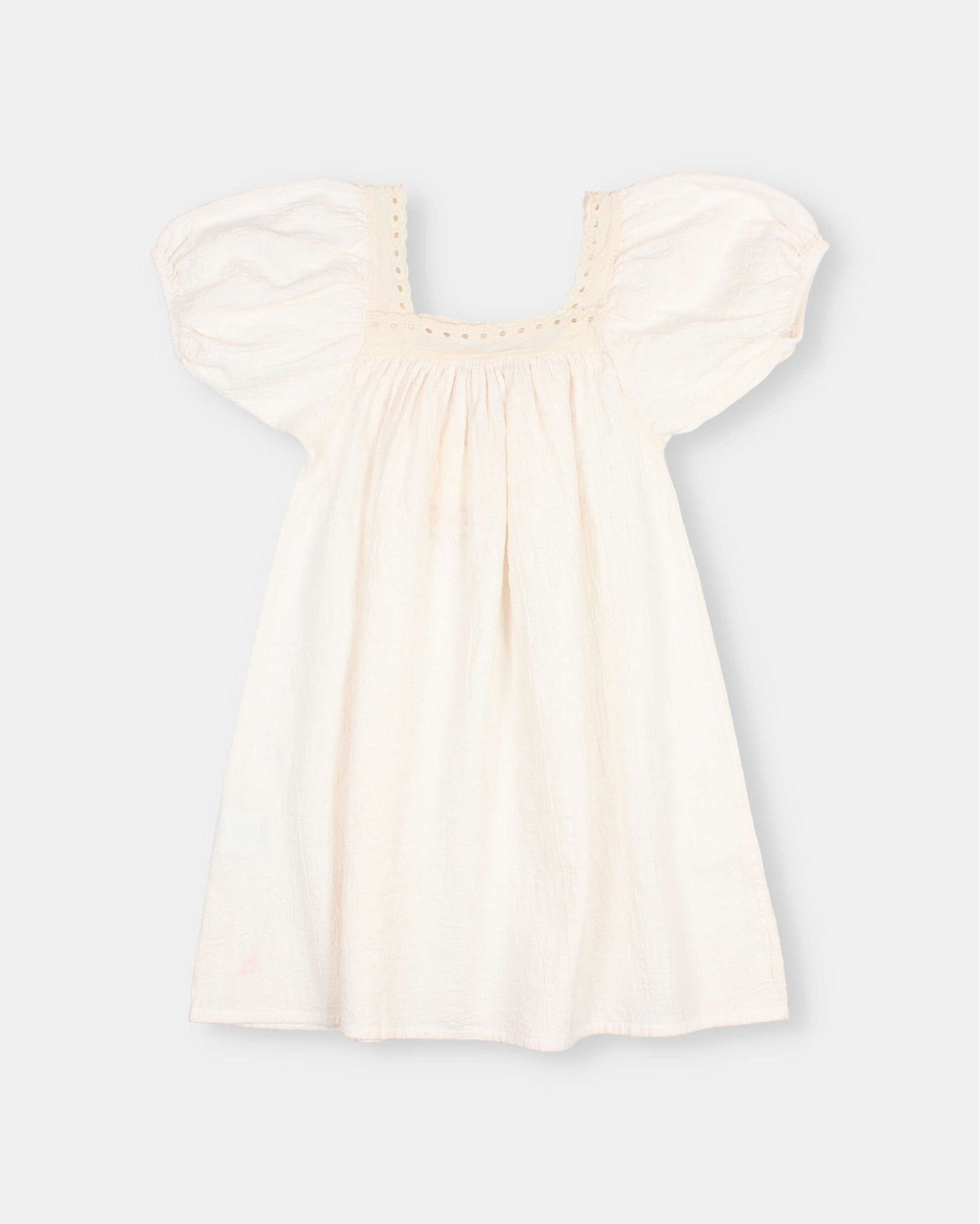 Vestido de algodón orgánico texturado. Escote cuadrado con detalle puntilla. Manga ancha abullonada acabada en goma elástica. Falda con vuelo. Detalle bordado a contraste en el lateral del bajo.