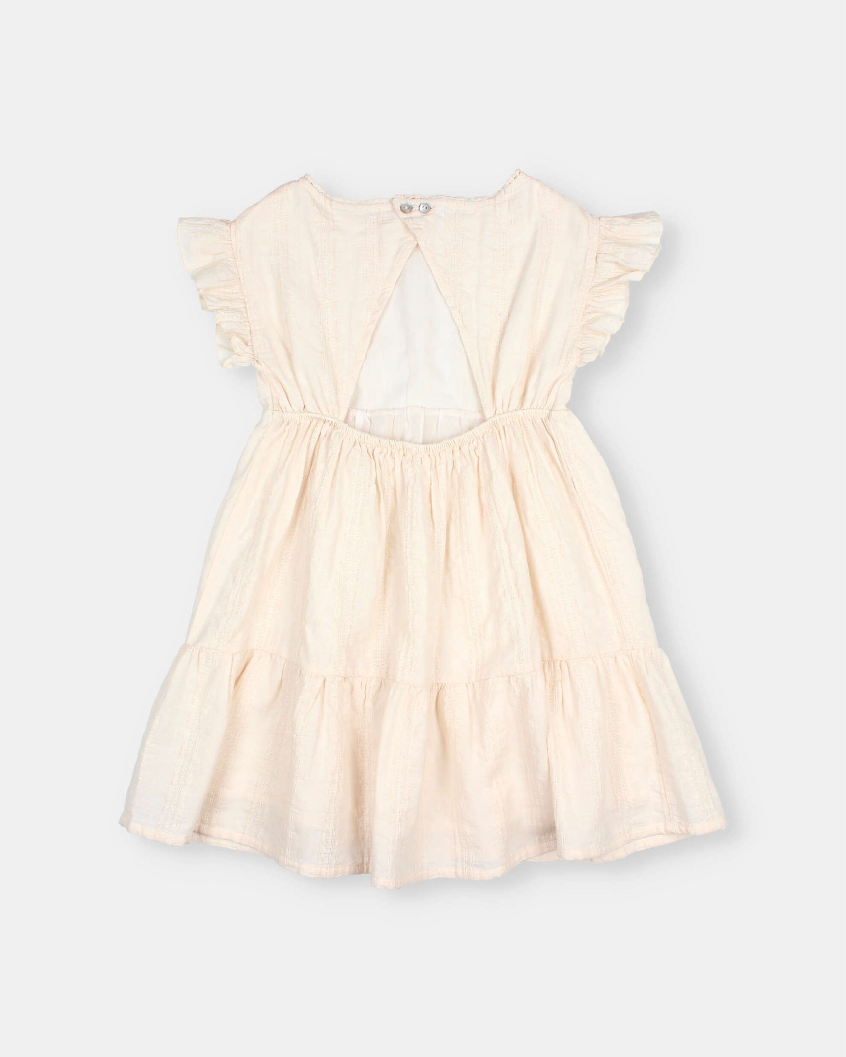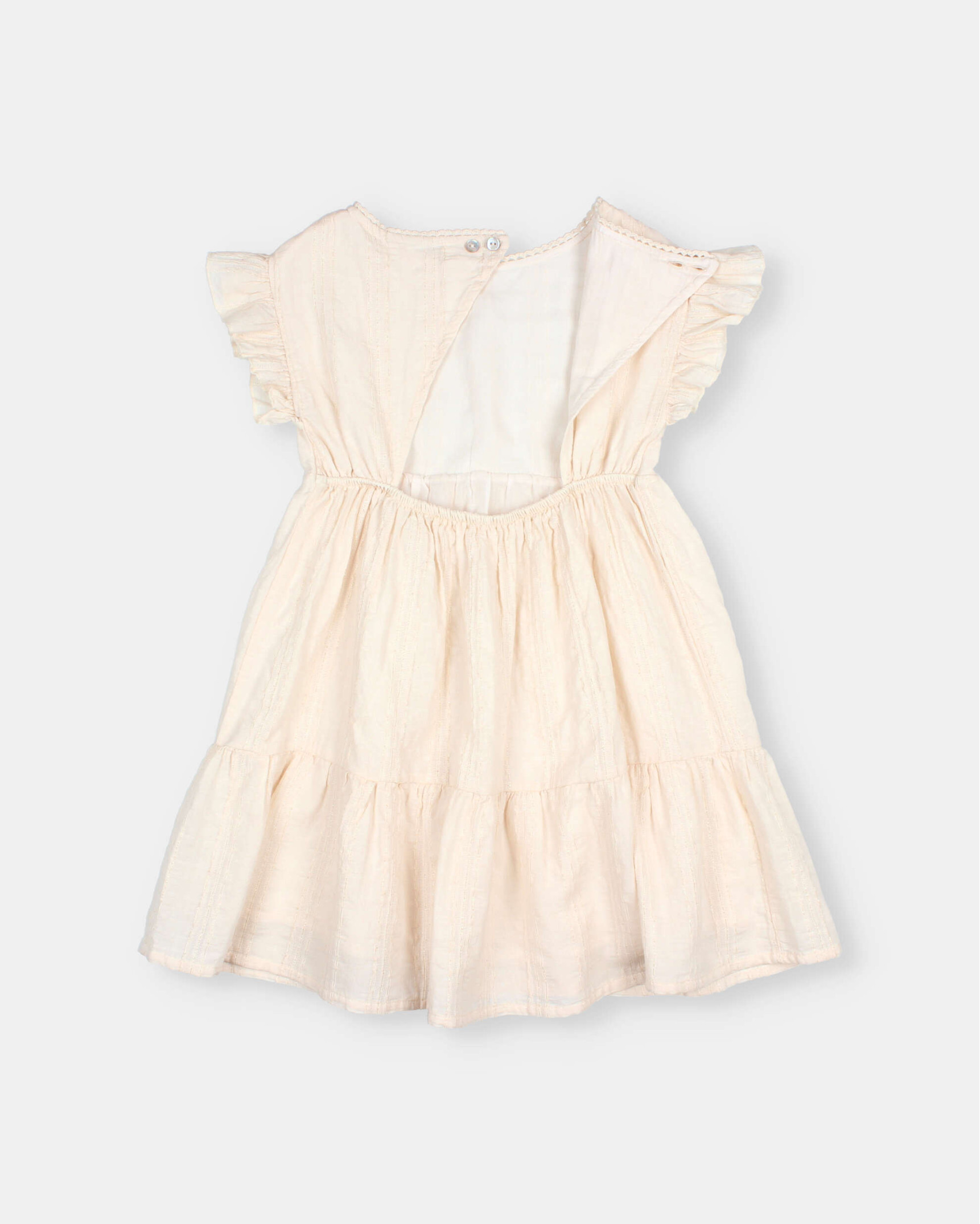 Vestido de voile de algodón con jacquard y delicadas rayas de lurex. Cuello redondo con detalle puntilla. Mangas con volante. Espalda abierta, con cierre con botones de nácar en el cuello. Goma elástica en la espalda de la cinturilla. Faldón con volante ancho en el bajo. Forro interior.