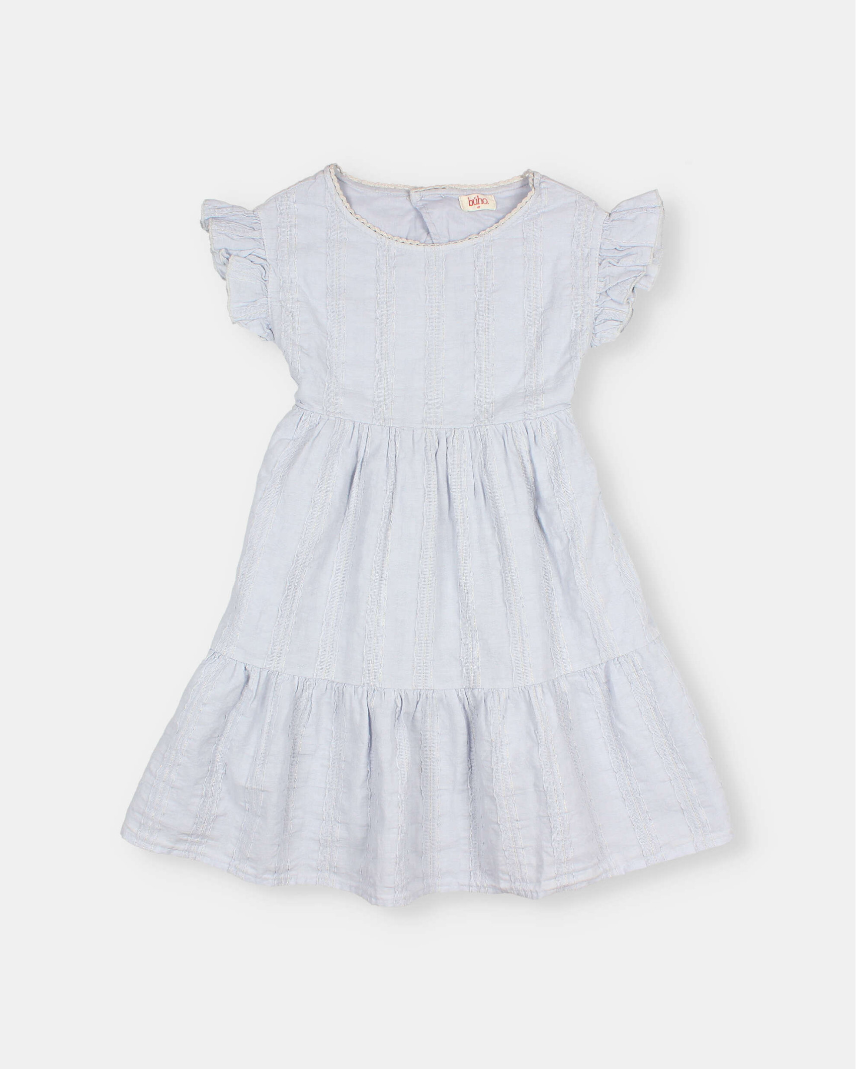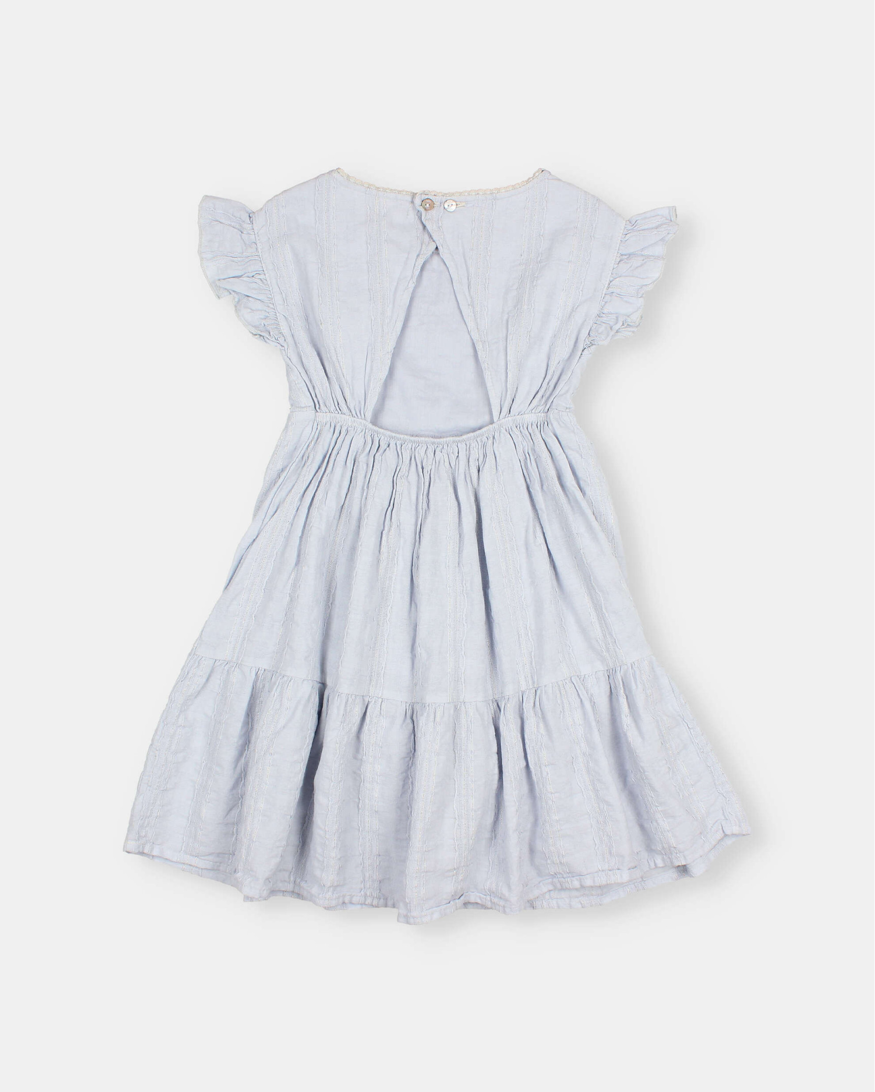 Vestido de voile de algodón con jacquard y delicadas rayas de lurex. Cuello redondo con detalle puntilla. Mangas con volante. Espalda abierta, con cierre con botones de nácar en el cuello. Goma elástica en la espalda de la cinturilla. Faldón con volante ancho en el bajo. Forro interior.