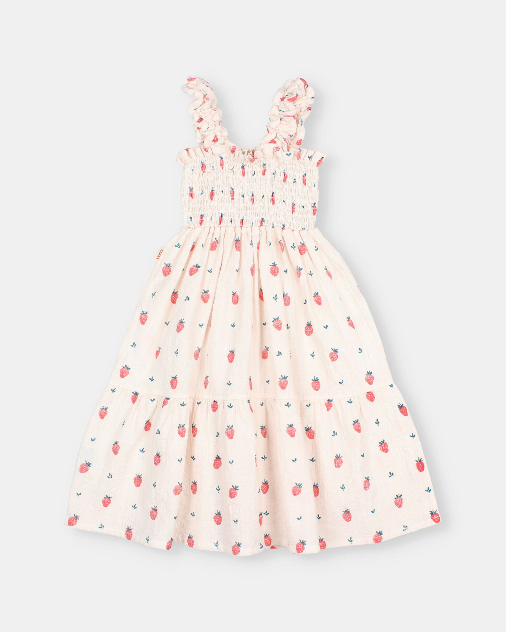 Vestido de algodón orgánico texturado con estampado strawberry. Cuello recto. Pecho elástico con fruncidos. Tirantes elásticos con volantes. Faldón fruncido con vuelo.